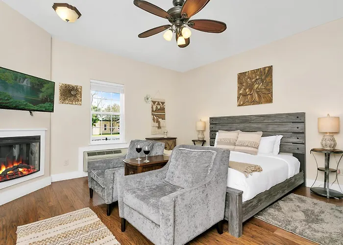 The welcoming rooms at Main Street Retreat #1 feature a luxurious king-sized bed, designed for utmost comfort and relaxation. Each apartment integrates contemporary amenities with stylish decor, ensuring an enjoyable stay for couples or solo travelers. Guests can unwind in the elegantly appointed spaces, which include ample natural light and tasteful furnishings, creating a soothing retreat.